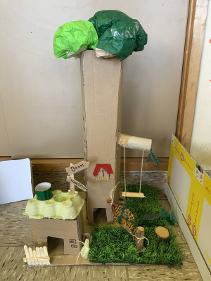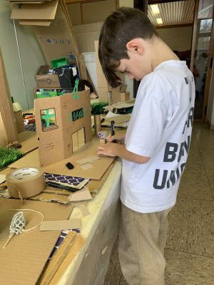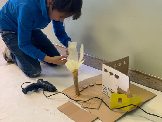 We luisteren naar verhalen en bewonderen installaties van karton.